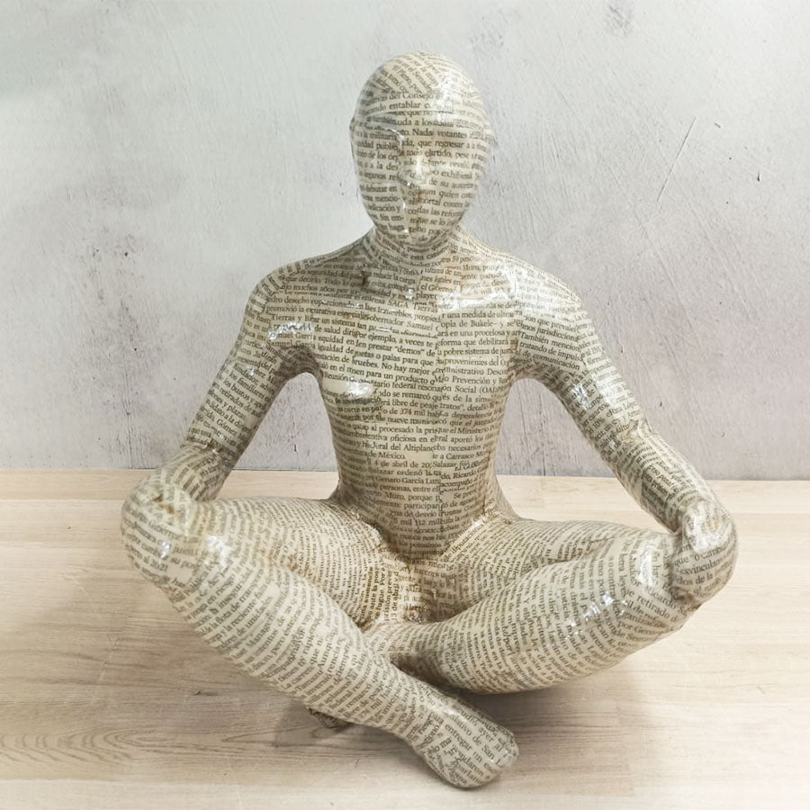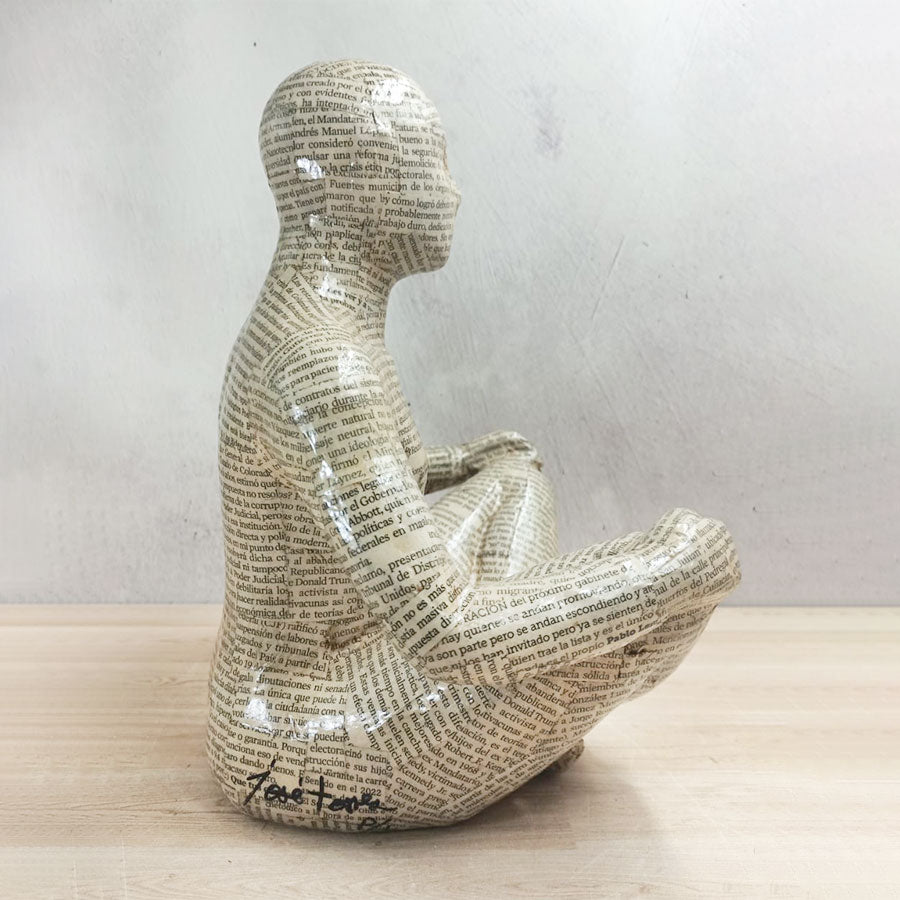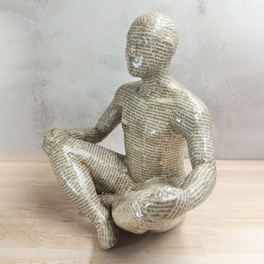 A contemporary style seated decorative figure made of clay and covered with sheets of newspaper-style text; it's an original piece that adds a different touch to any space in your home or office.