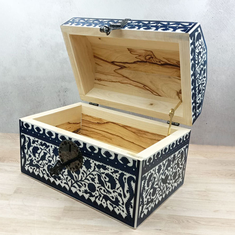 The lacquer technique requires a lot of patience and skill. It can take up to 3 months to make a chest and the tools used to decorate it are brushes made from cat hair and chicken feathers because the work required is very fine.