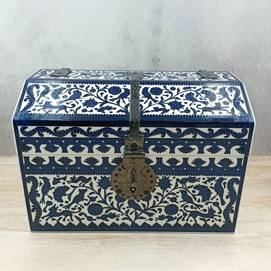 Add a touch of art and functionality to your home with this beautiful antique-style single-compartment trunk with a key and ironwork, decorated with floral and animal motifs. It is handmade by artisans from Olinalá, Guerrero, using the lacquering and scratching technique on linaloe wood. This technique involves mixing several layers of earth and pigments with natural oils or fats. After drying, it is smoothed or polished, and the necessary parts are removed with a maguey or huisache thorn to reveal the desired motifs and design, thus creating a unique piece.