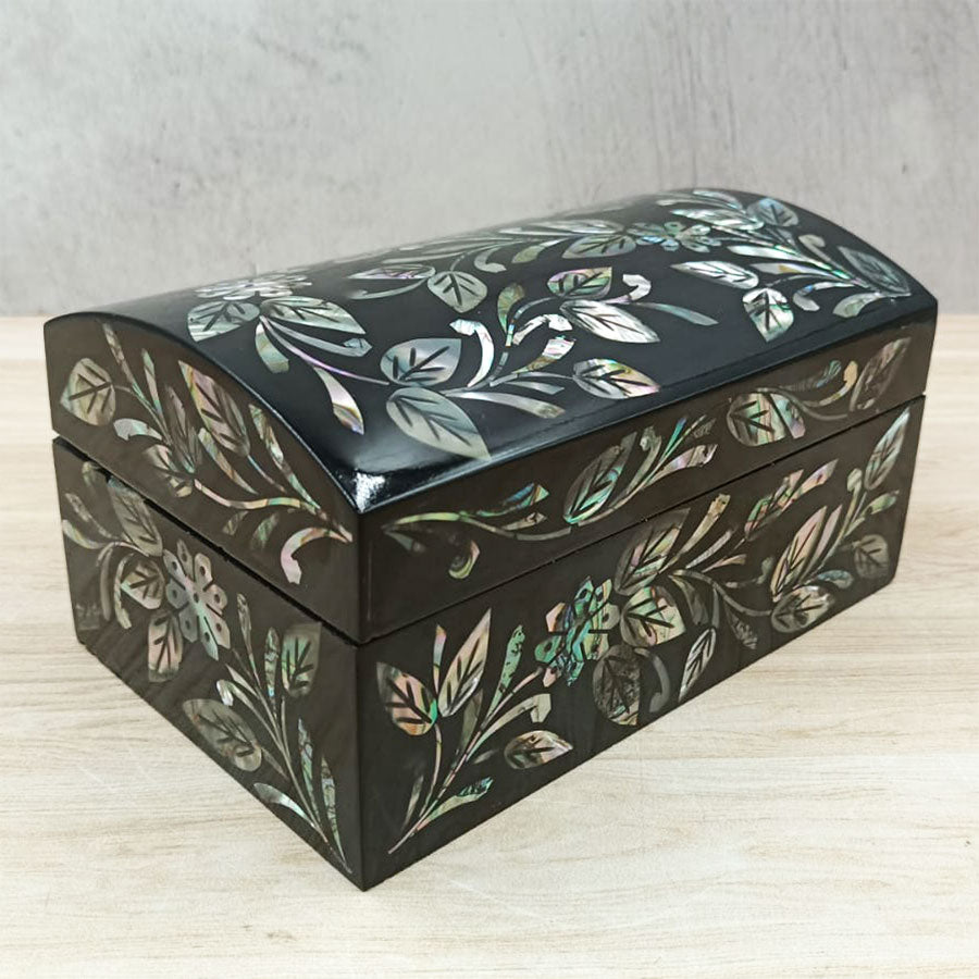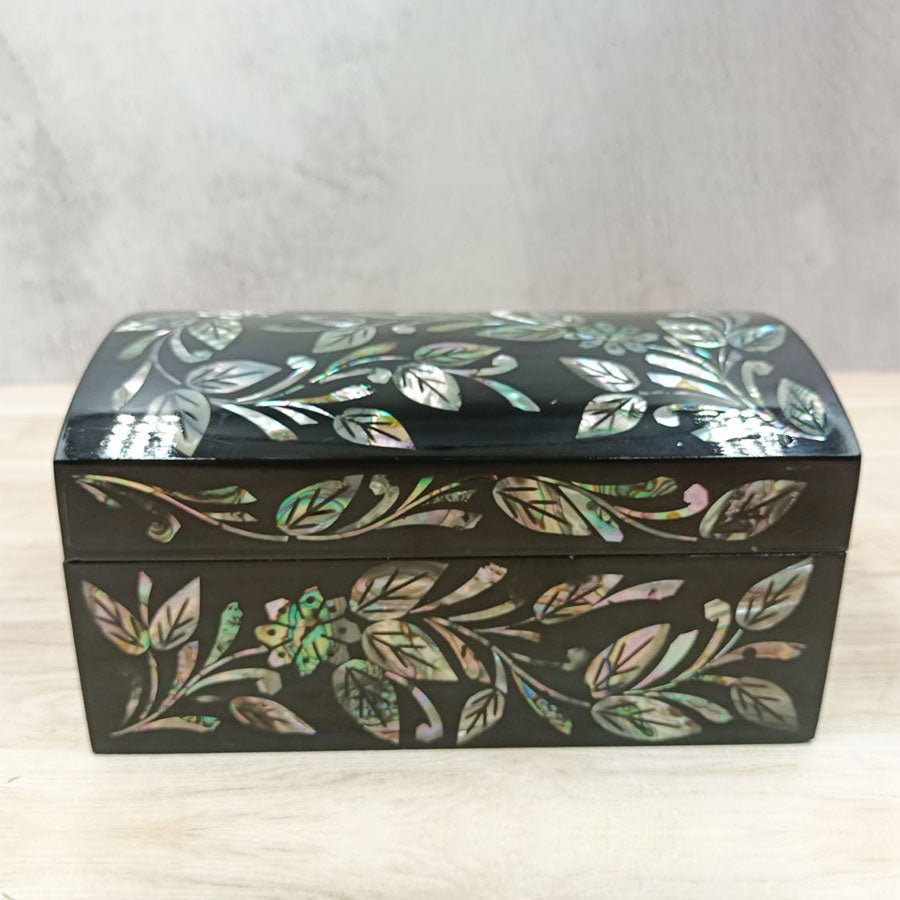 Single-compartment trunk made of wood with abalone shell inlays that form geometric figures, birds, flowers and foliage; it is made by Otomi artisans who use woods such as cedar, mahogany, mesquite, but they mainly work with juniper for its easy handling and special color.