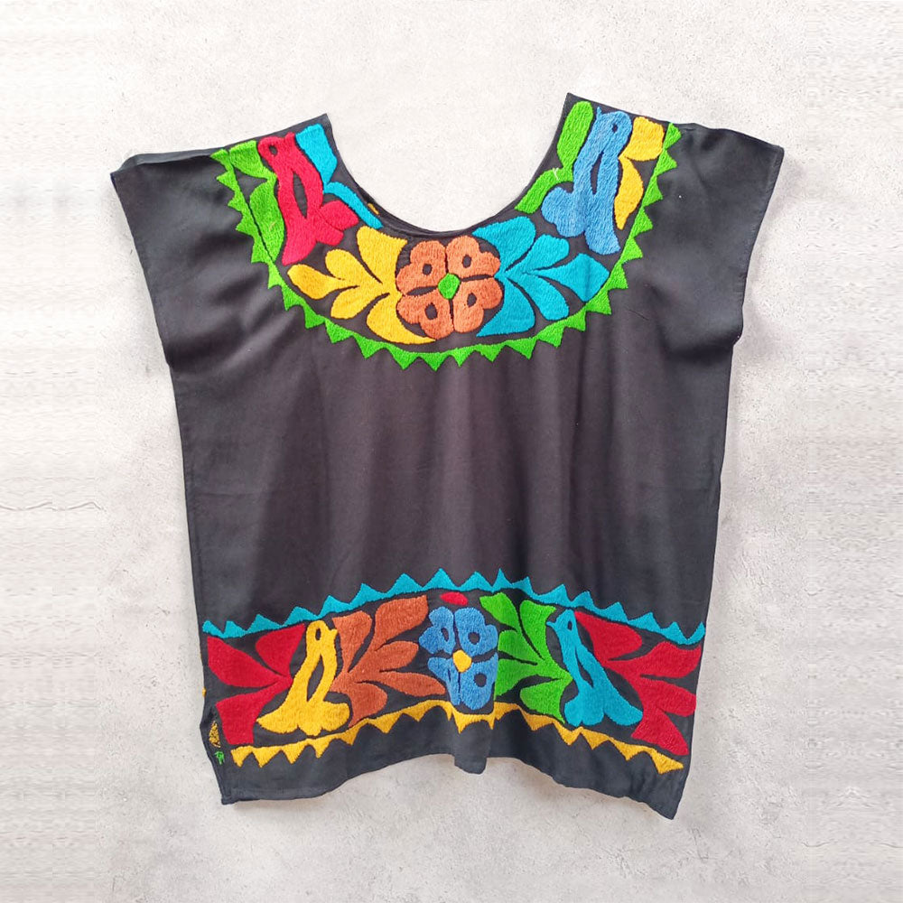 Traditional black blouse with hand embroidery of motifs based on birds and flowers of different colors made by women from Oaxaca with fresh fabric. It's a garment that can be easily combined with jeans or a skirt.