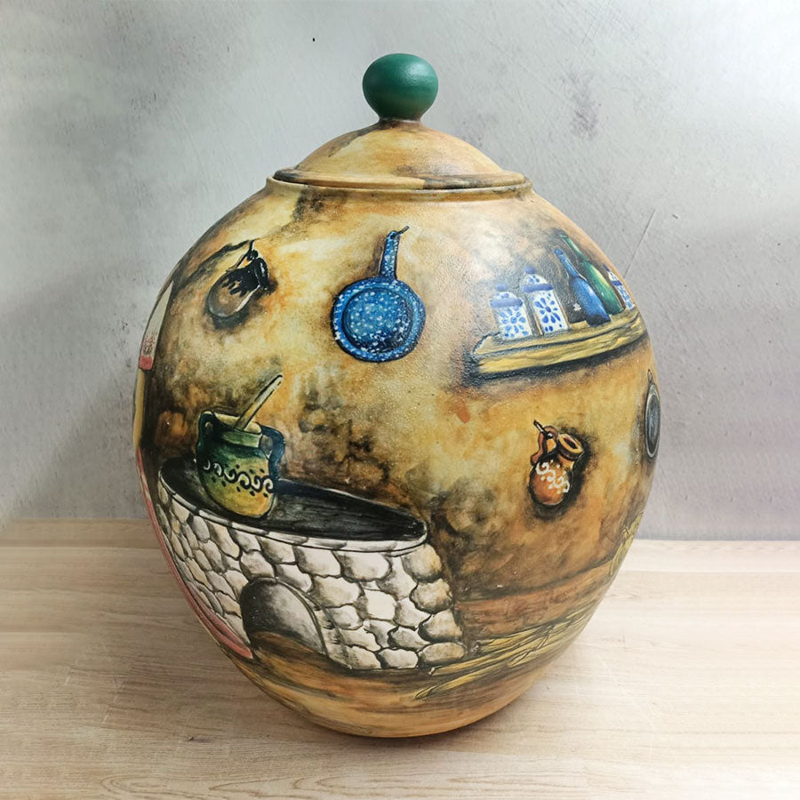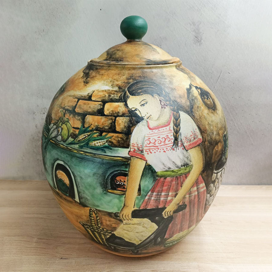A beautiful candy jar-shaped vase, made of majolica ceramic and decorated with a brown hue depicting a woman preparing food in a rustic Mexican kitchen. It's a unique piece to place in your kitchen or any other room in your home. It's handcrafted by artisans in Guanajuato.