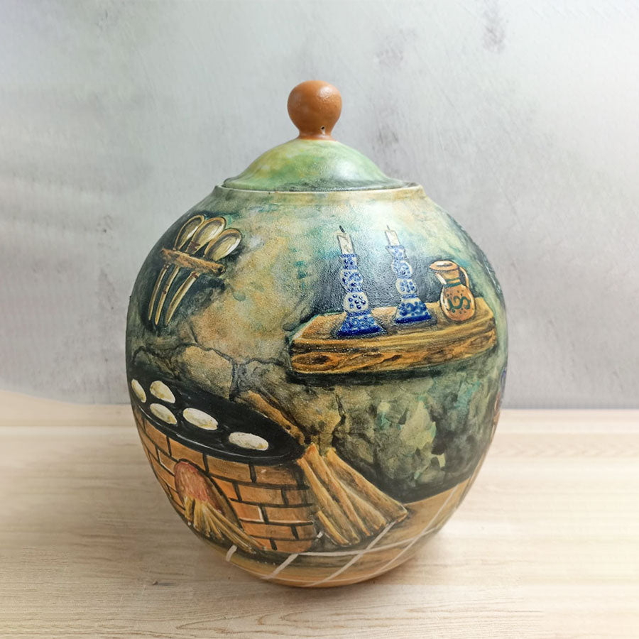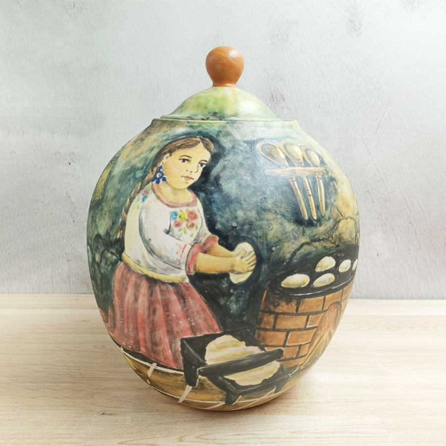 Add a special touch to your kitchen or any other space in your home with this beautiful candy jar-shaped vase made of majolica ceramic and decorated with traditional Mexican kitchen motifs in green. It is handcrafted by artisans in Guanajuato.