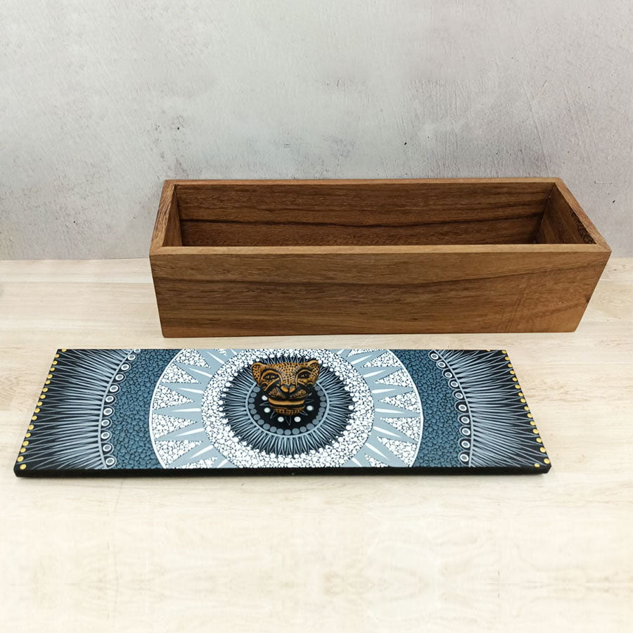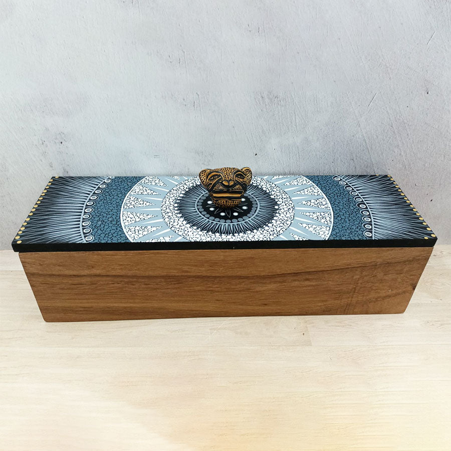 Rectangular box with brown lid with geometric motifs and a jaguar head