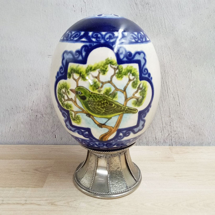 Add this unique, hand-painted egg-shaped piece to your decor. It features a small bird and branches, along with alpaca silver accents (a metal alloy also known as nickel silver). This one-of-a-kind piece was crafted by the renowned workshop of J. Guerrero Santos.