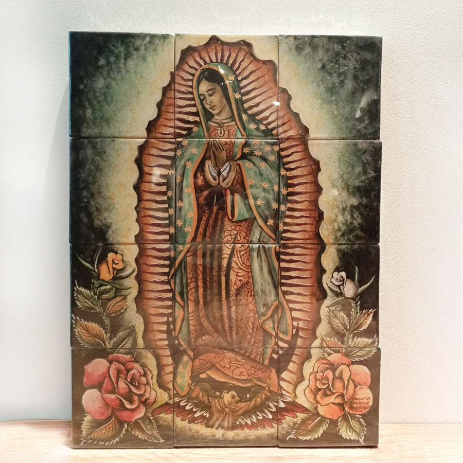 Beautiful religious wall decoration made of hand-painted majolica ceramic tiles depicting the Virgin of Guadalupe. Ideal for display in a prayer room, garden, living room, or terrace.