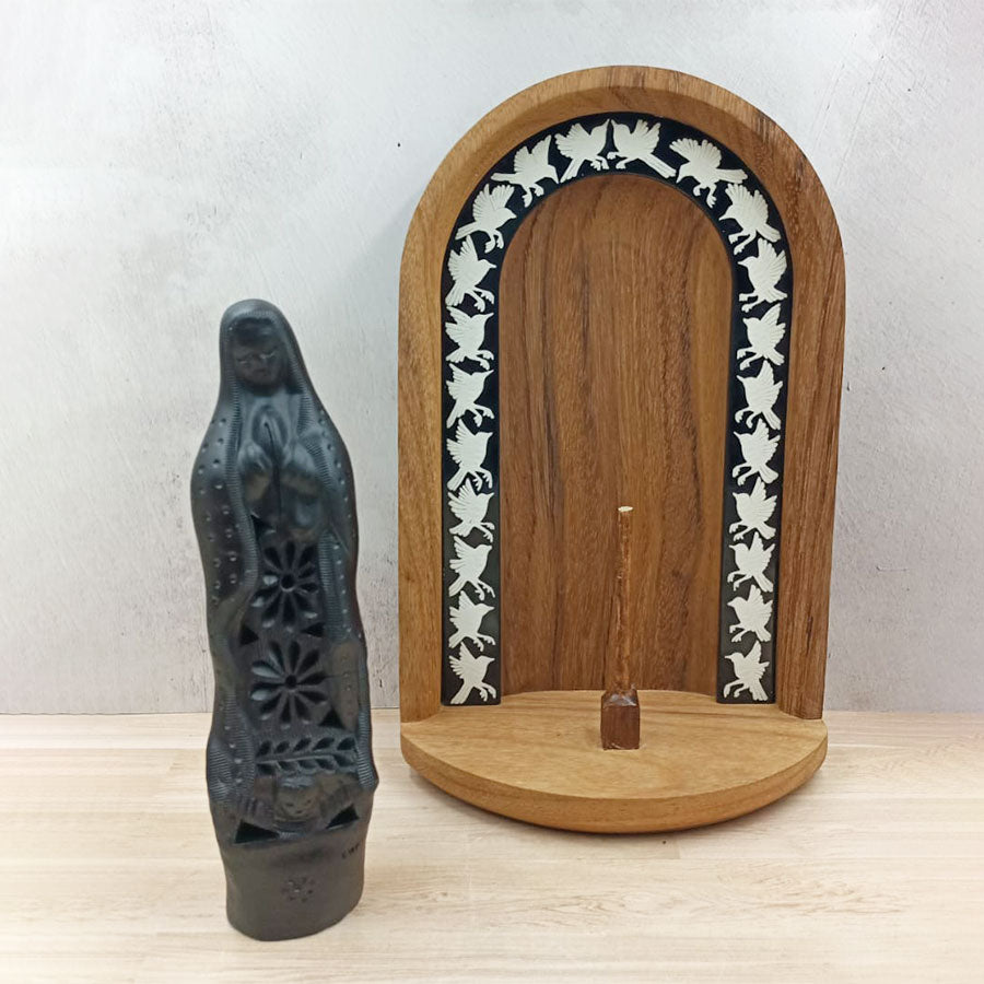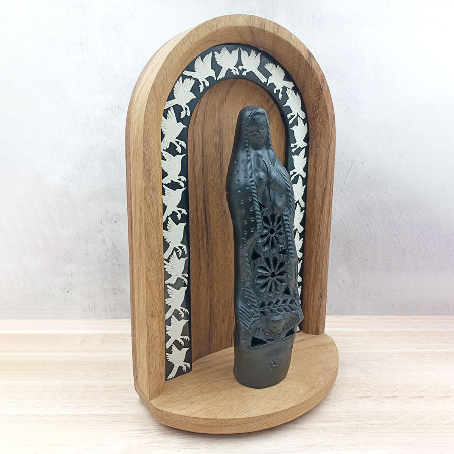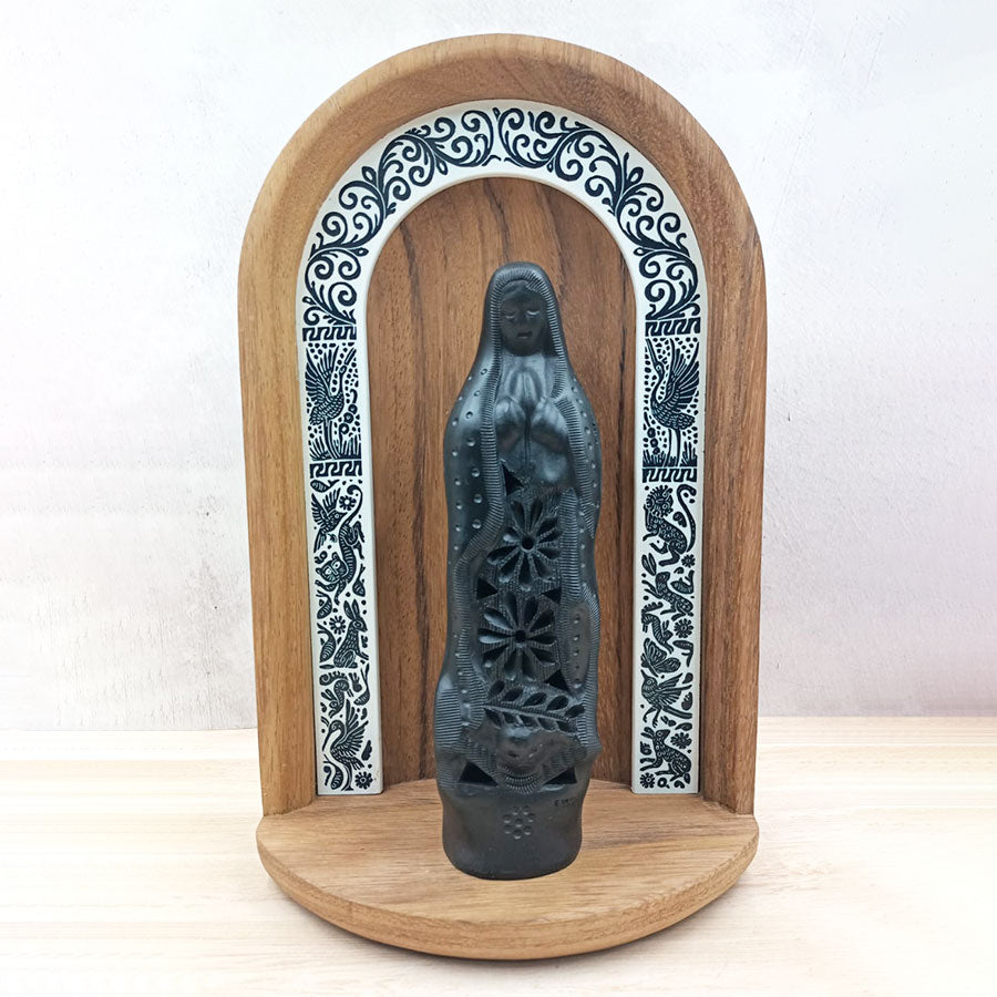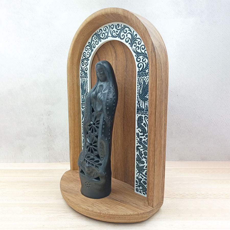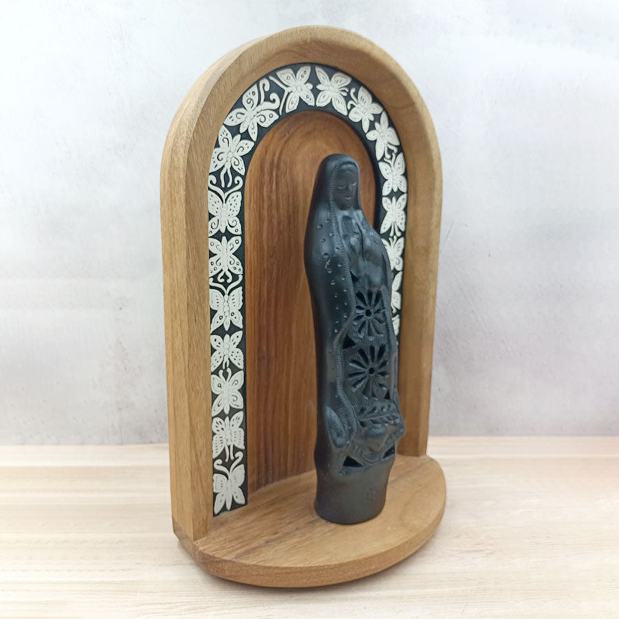 Complement any space in your home with this original niche that combines two types of crafts: the wooden niche decorated with motifs worked using the traditional lacquer and stripe techniques of Olinalá, Guerrero, and the image of the Virgin of Guadalupe in black clay handmade by artisans from Oaxaca.