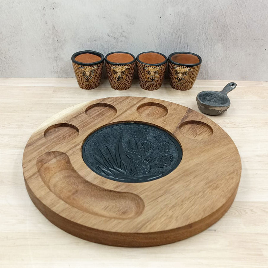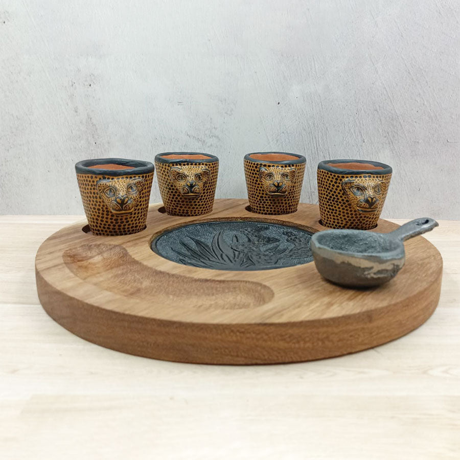Accompany your home gatherings with this special wooden tray set featuring four jaguar-designed clay mezcal glasses and a small saucer shaped like a frying pan. It's also an original gift idea for tequila and mezcal lovers.