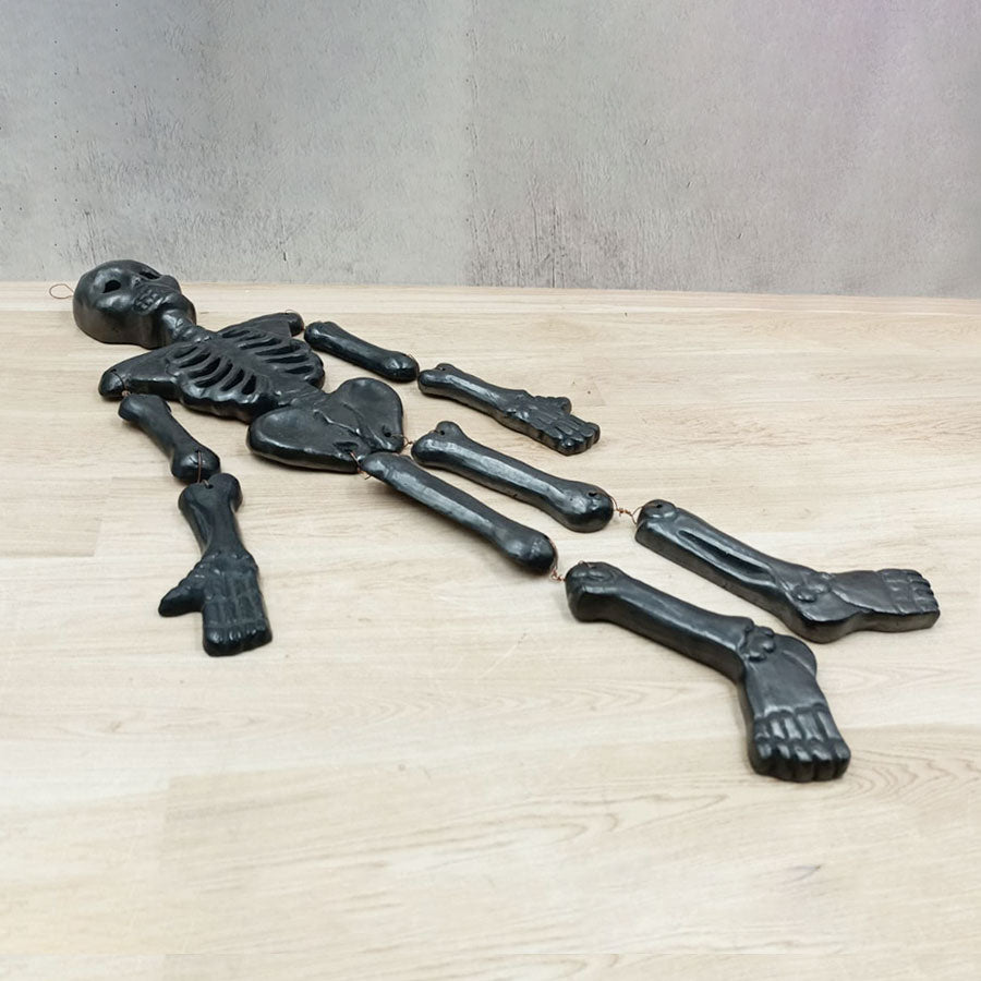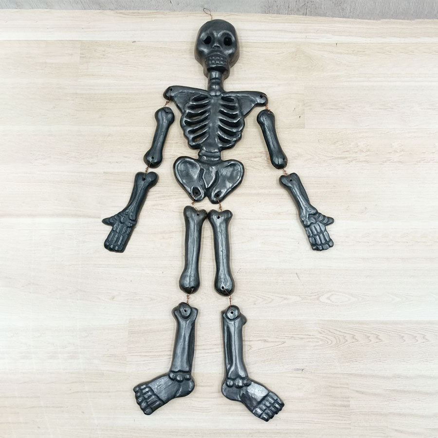 Decorate your Day of the Dead altar or offering with this small skull made of black clay and assembled with articulated limbs that make it a fun piece.