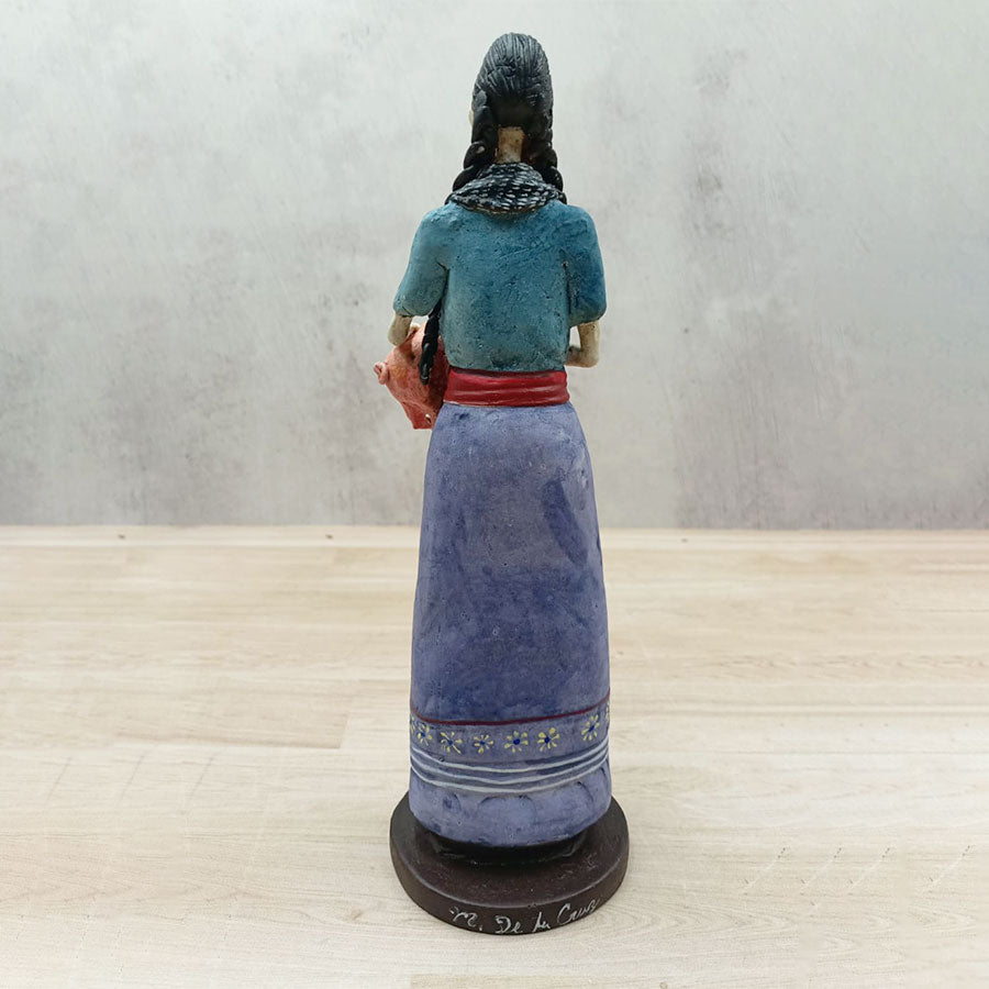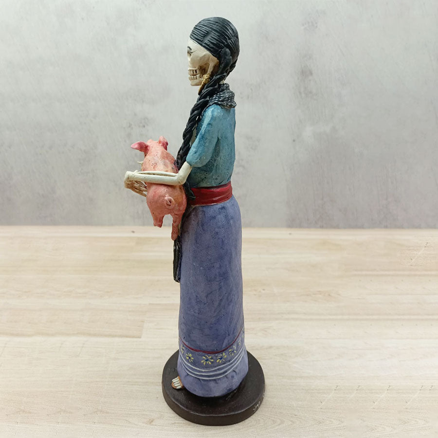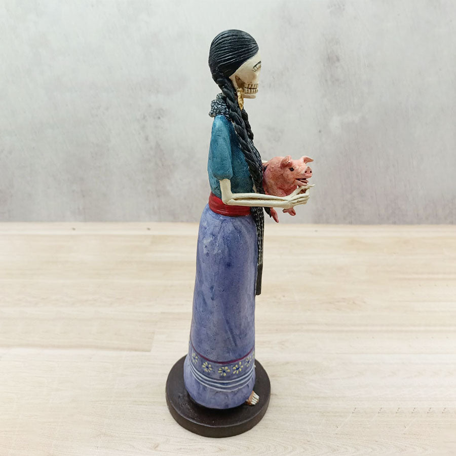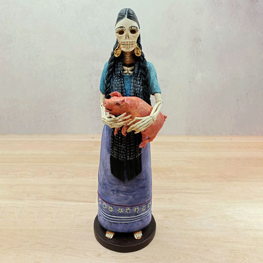 The catrina can be represented in a classic style or in everyday rural situations, like this one where she is carrying a pig. Handmade by Michoacán artisans from clay and decorated with acrylic or vinyl paint, it is an example of traditional Day of the Dead craftsmanship.