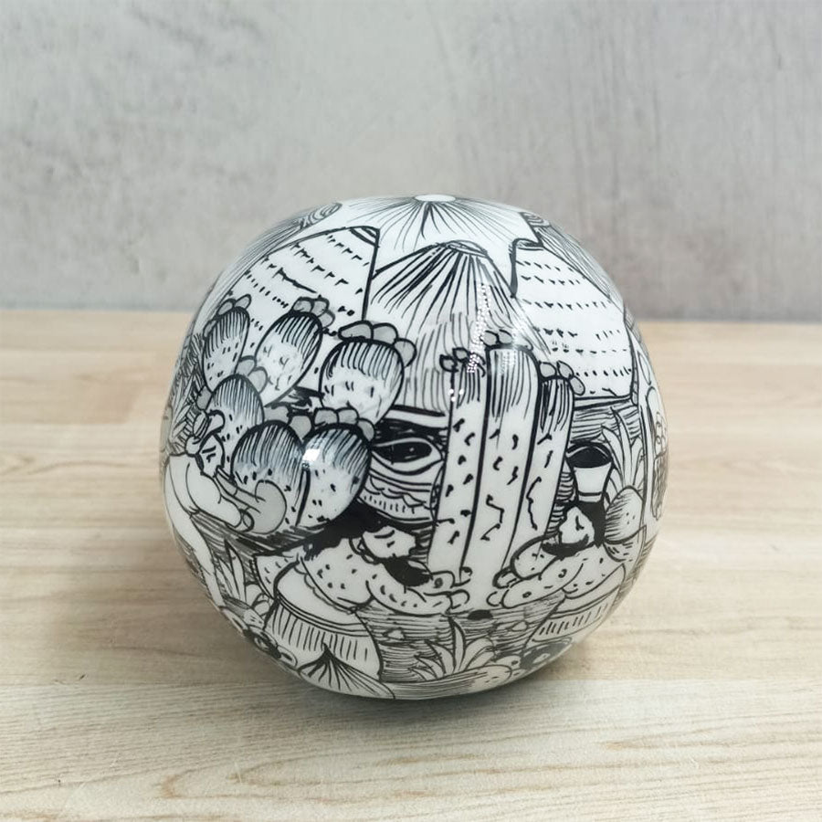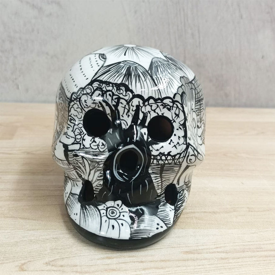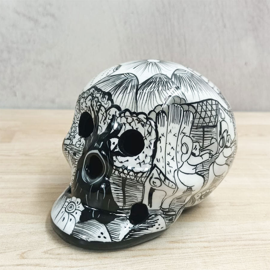 Hand-painted skull with traditional scenes from the Mexican countryside, it is a figure that can be used to decorate on the Day of the Dead.