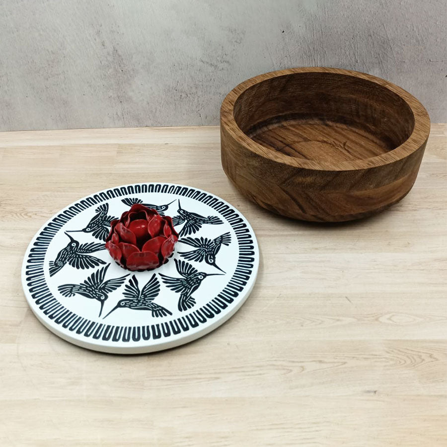 Add a unique touch to your table with this carved wooden tortilla holder with a lid featuring hand-painted details and a flower-shaped handle. The tortilla holder is a must-have on any Mexican table, as it helps keep traditional tortillas or even small pieces of bread warm. This tortilla holder can also be used as a beautiful decoration.