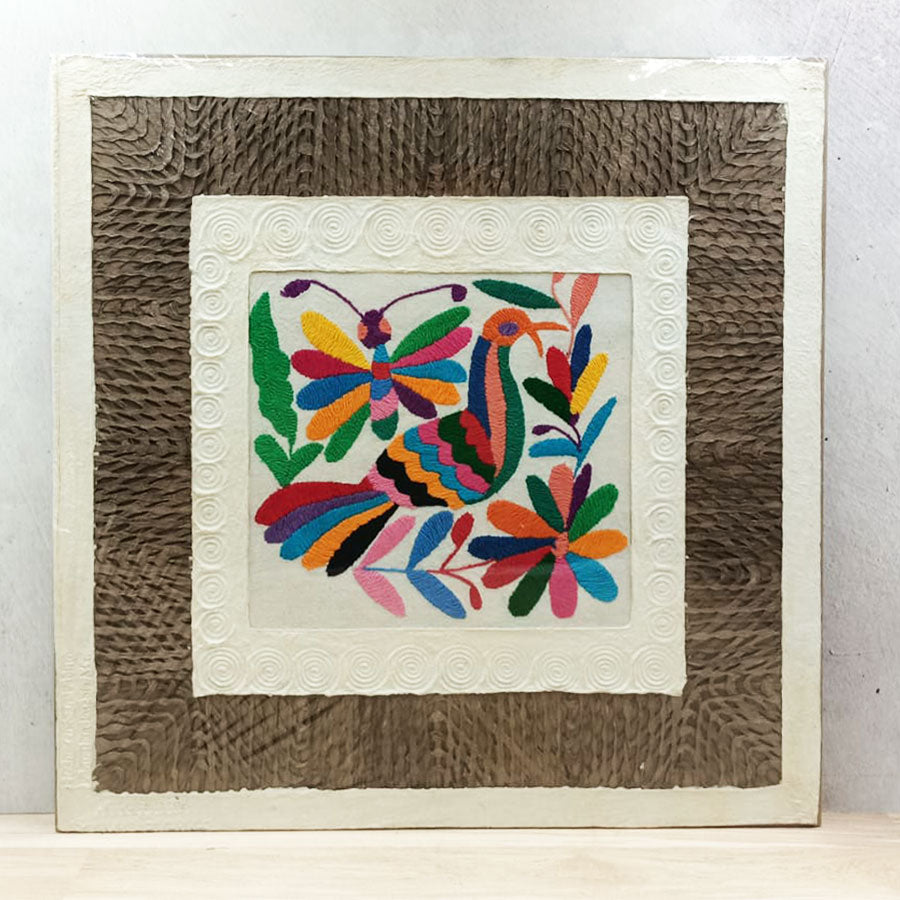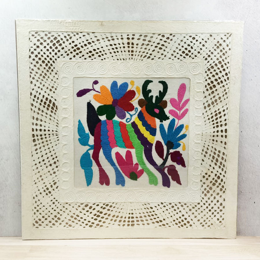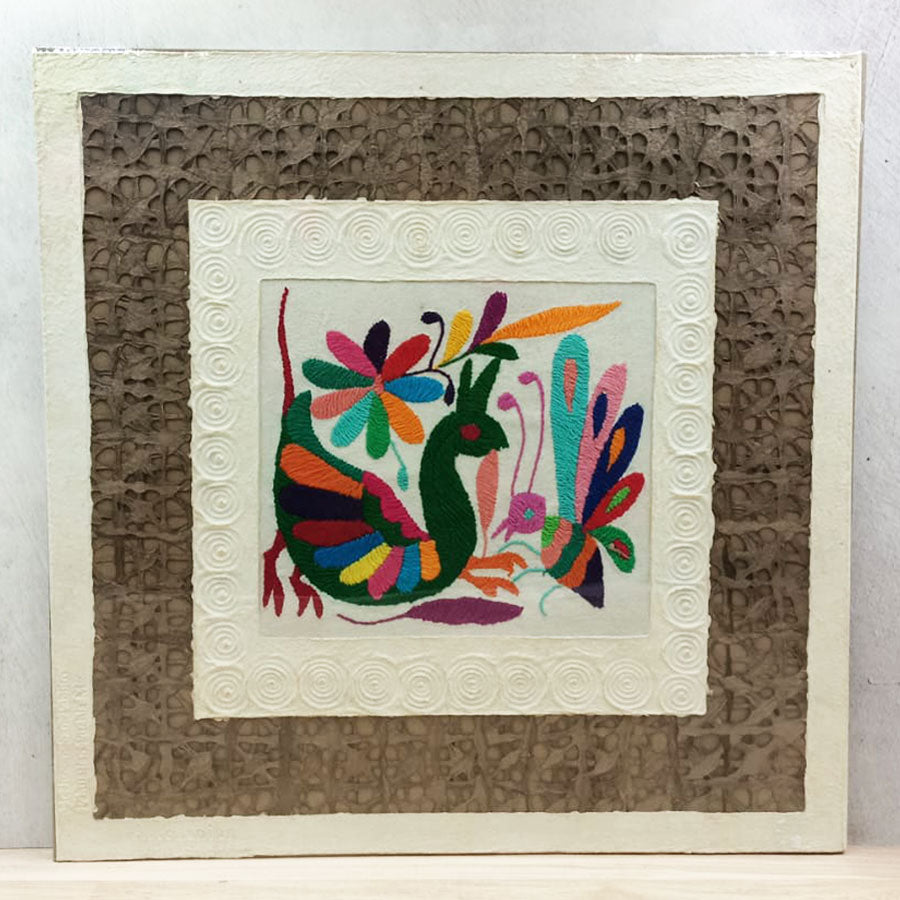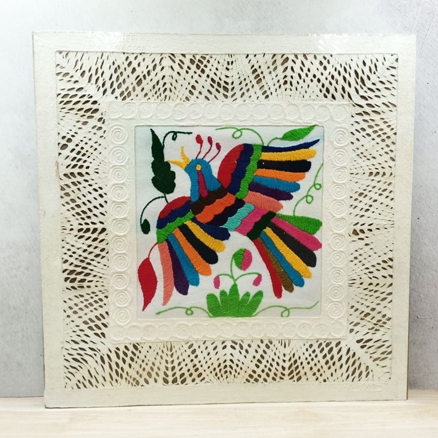 Llena cualquier espacio de autenticidad con esta combinación de arte ancestral entre papel amate calado y bordados de diseño otomí multicolor que se pueden enmarcar para crear hermosos cuadros para decorar.