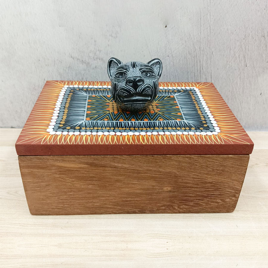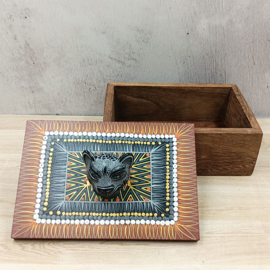 Original caja de madera de usos múltiples o como decoración, la tapa está pintada a mano con detalles originales que la convierte en una pequeña obra de arte, además de tener una cabecita de jaguar como mango o pomo hecho de barro.
