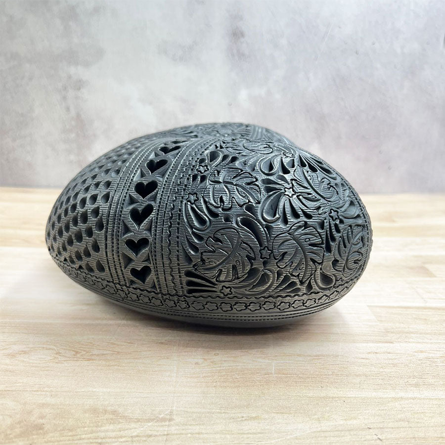 Fantástica pieza en forma de corazón con lindos detalles calados; está hecha con barro negro por artesanos de Oaxaca. Está decorado con técnica de esgrafiado y pulido con piedras de cuarzo o con carrizitos, al final de este proceso se pone a cocer en un horno bajo tierra en donde al alcanzar el rojo vivo se tapa el horno para reducir el oxígeno y así obtener su característico color negro.