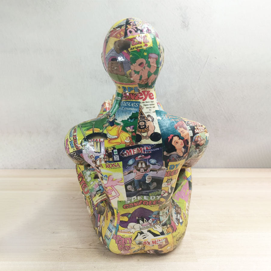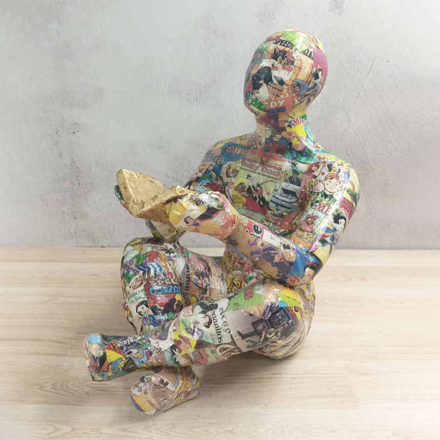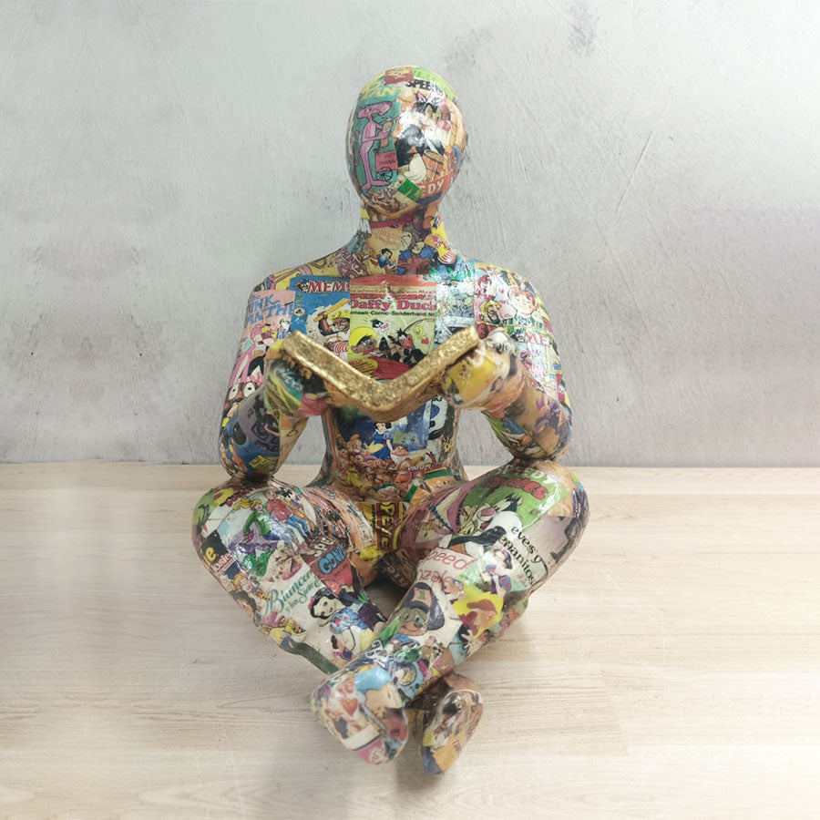 Figura decorativa sentada con libro abierto de estilo contemporáneo hecha de barro y forrada con hojas de historietas de personajes como Archie, Popeye, Speedy Gonzales y otros; es una pieza llena de colores vibrantes que dará vida a cualquier espacio de tu hogar u oficina.