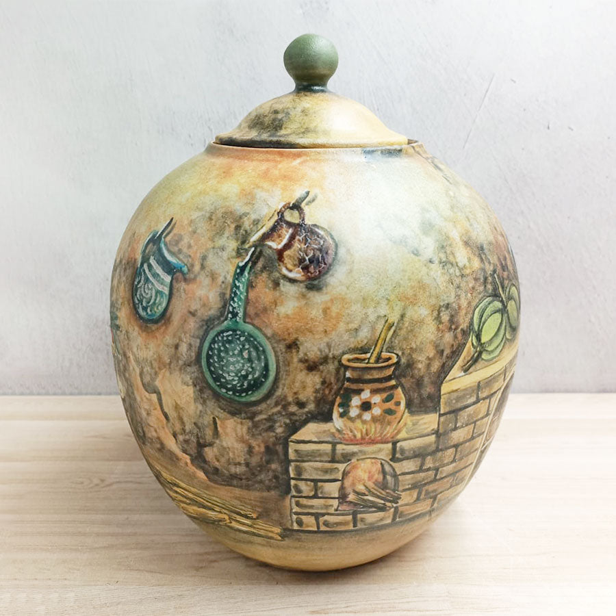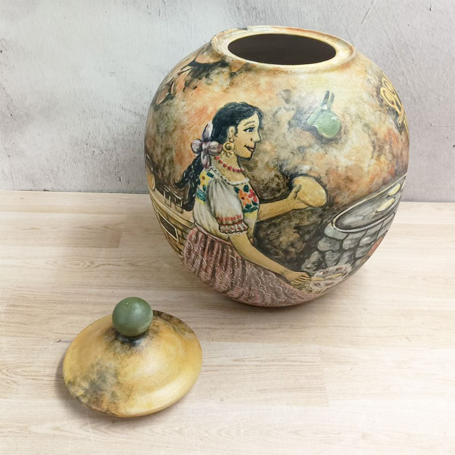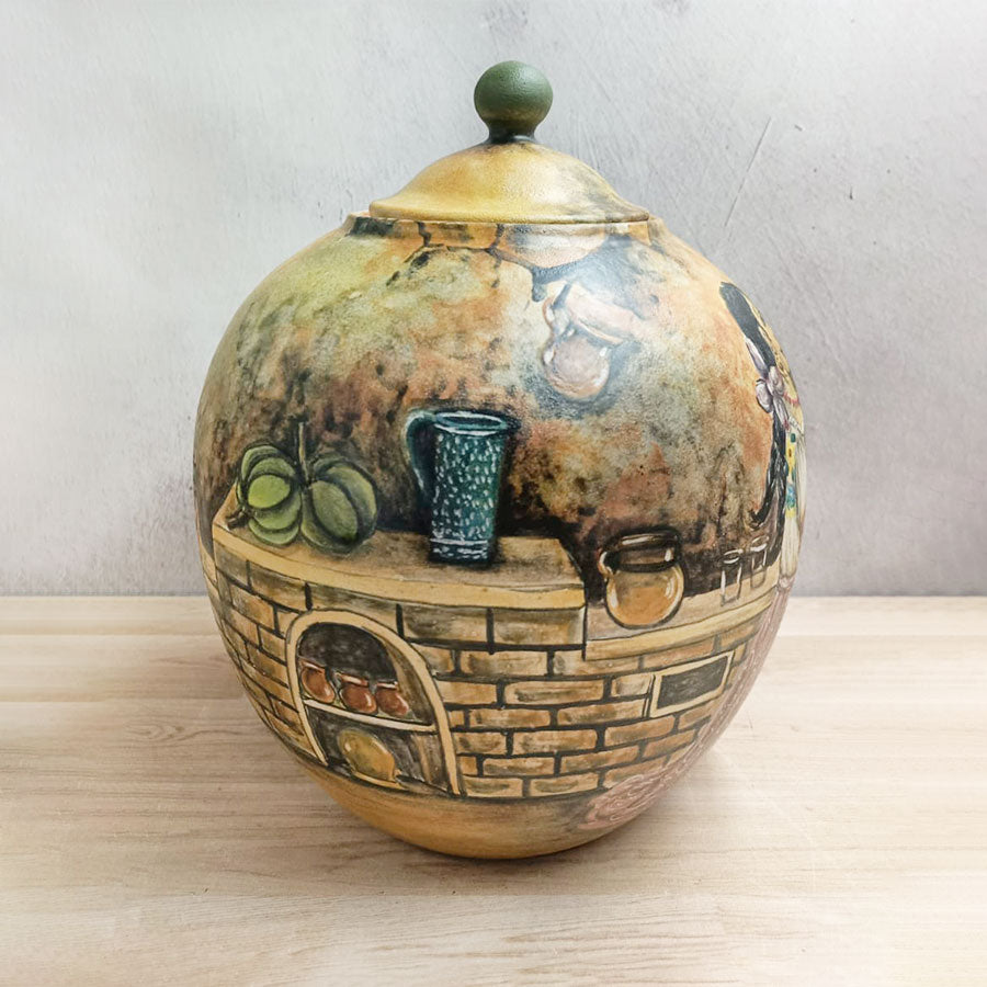 Añade un toque especial a tu cocina o cualquier otro espacio de tu hogar con este bonito jarrón en forma de bombonera hecha en cerámica mayólica y decorada con motivos de una cocina tradicional mexicana. Está elaborada por artesanos de Guanajuato.