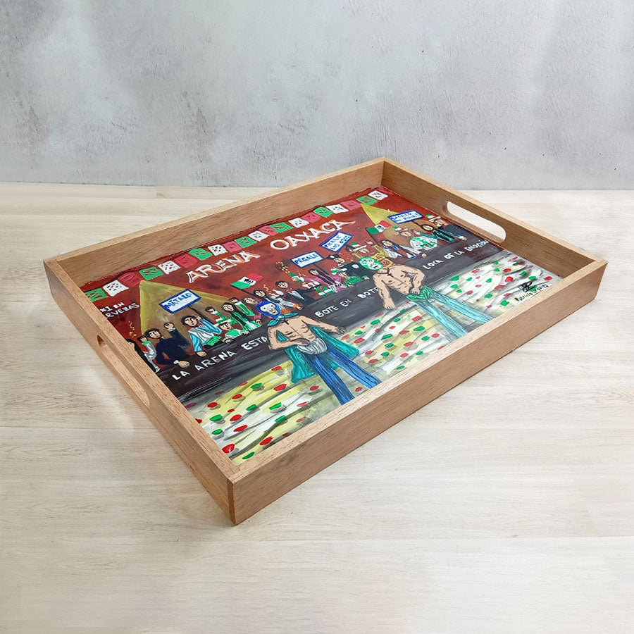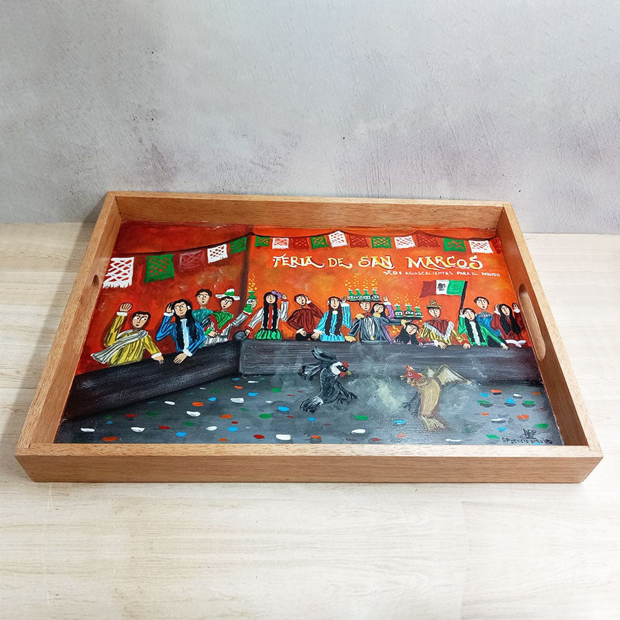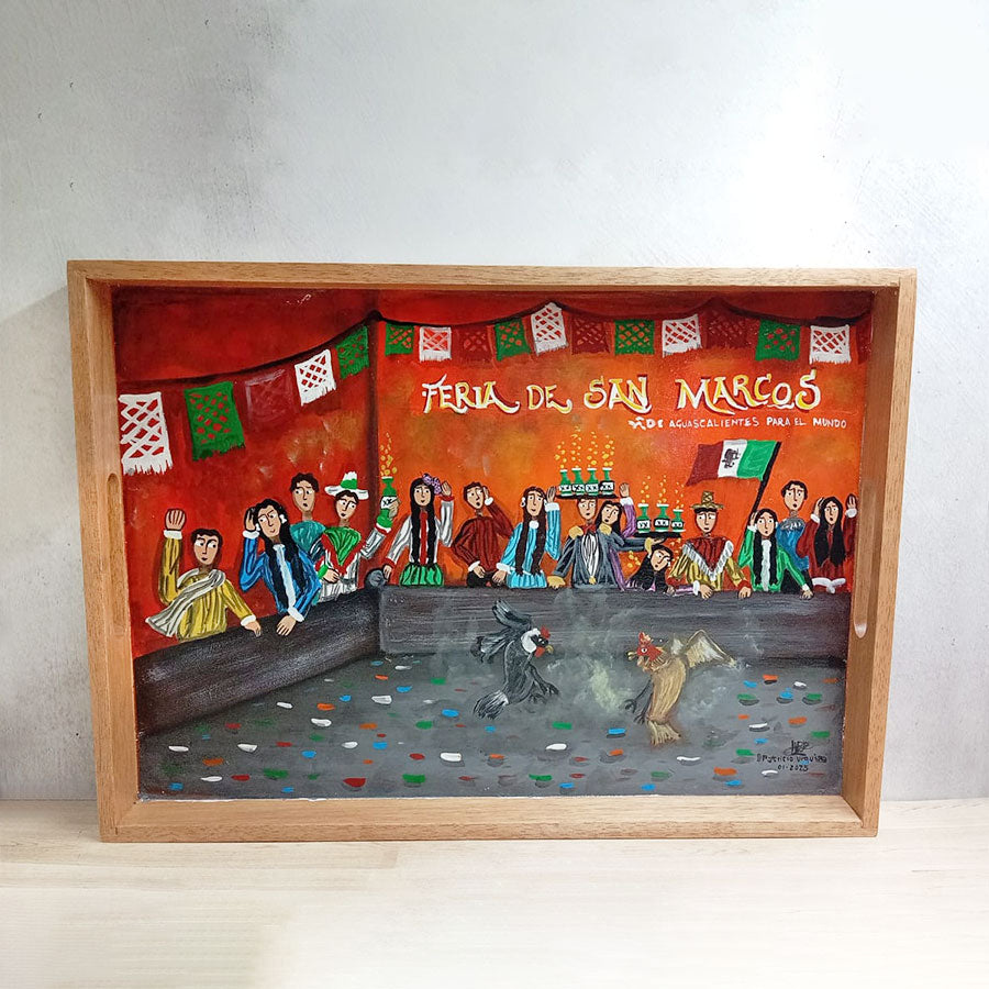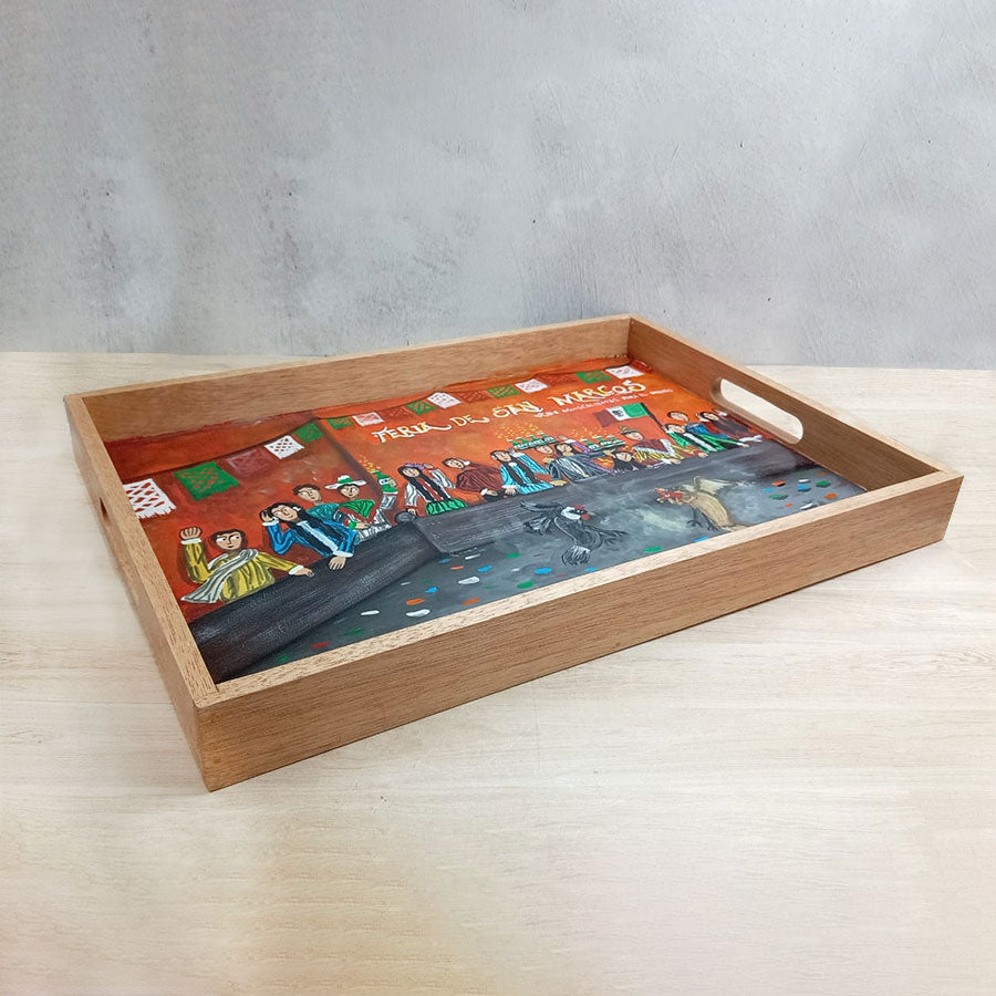 Charolas de madera y pintadas con originales escenas de estilo costumbrista en las que su autor retrata lugares y escenas pintorescas del México del ayer y de hoy, así como tradiciones de la cultura mexicana. Realizadas en colores vibrantes, son una muestra de arte y funcionalidad ya que se pueden usar para servir o solo como decoración de cualquier espacio.