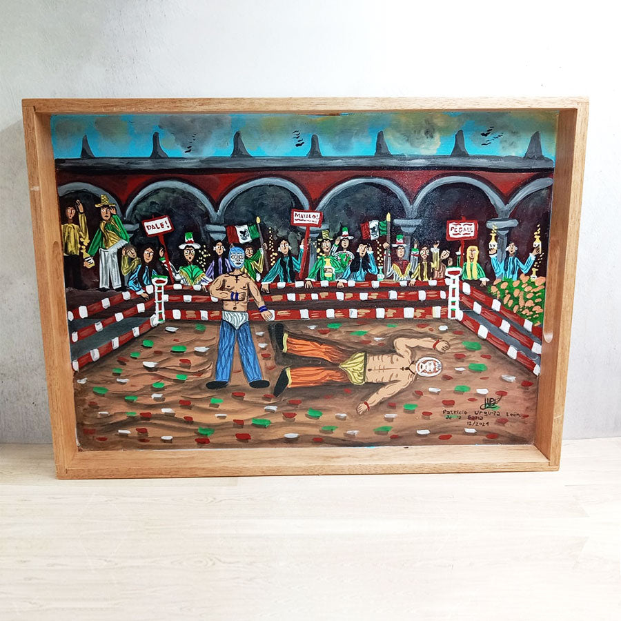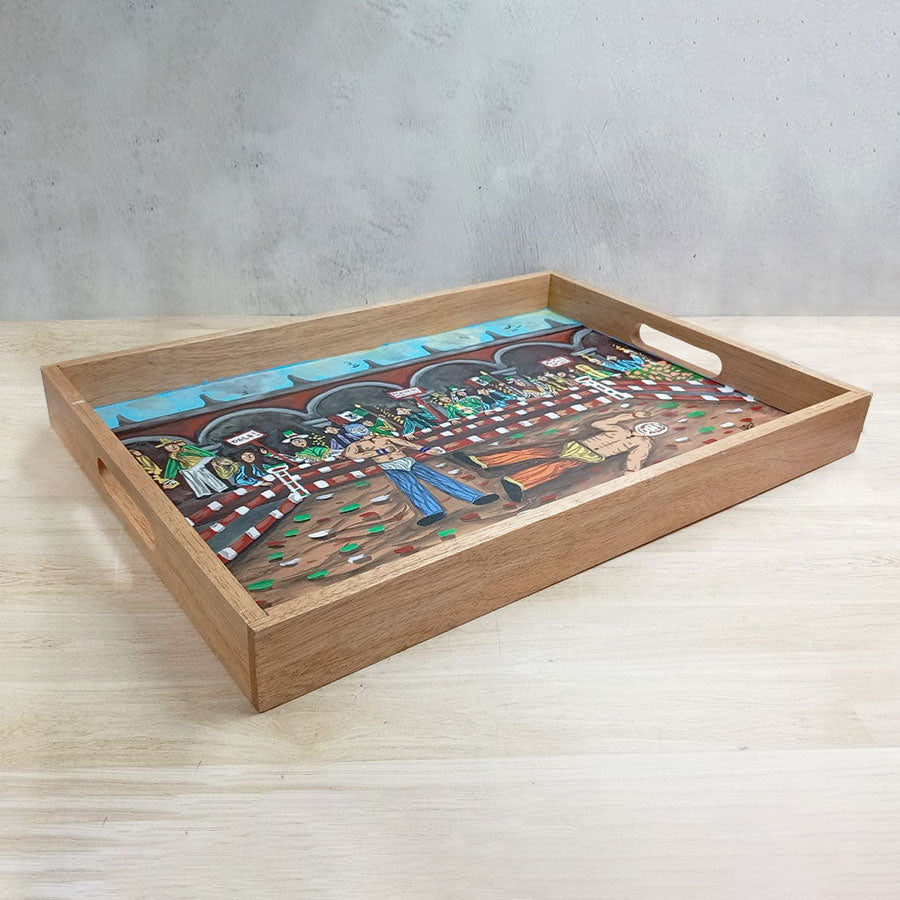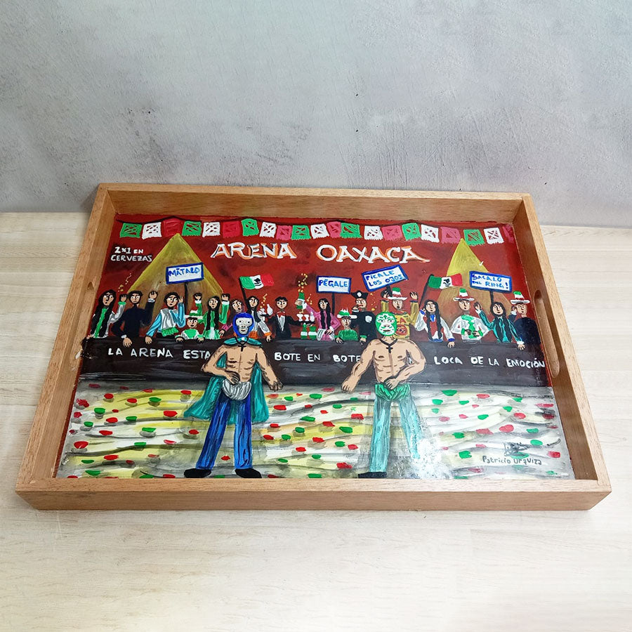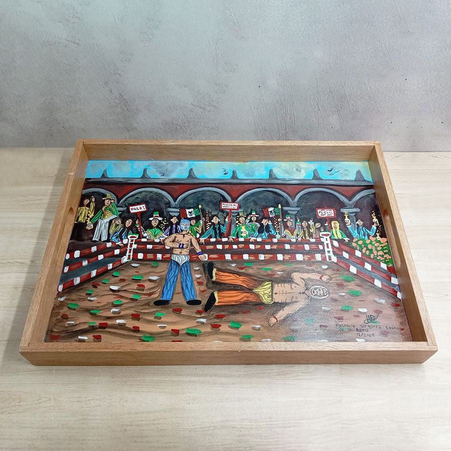 Charolas de madera y pintadas con originales escenas de estilo costumbrista en las que su autor retrata lugares y escenas pintorescas del México del ayer y de hoy, así como tradiciones de la cultura mexicana. Realizadas en colores vibrantes, son una muestra de arte y funcionalidad ya que se pueden usar para servir o solo como decoración de cualquier espacio.
