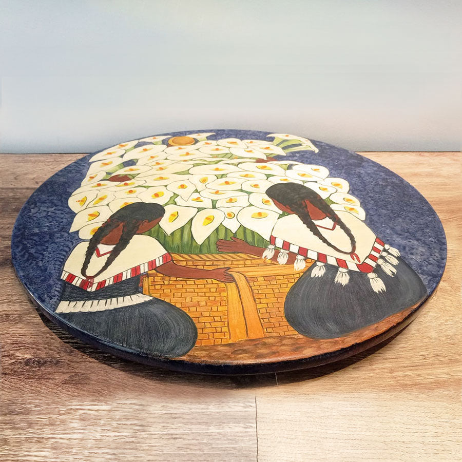 Esta pieza está hecha en madera y pintada a mano con hermoso diseño de mujeres con alcatraces, basado en las pinturas de Diego Riviera; además está terminada con una laca especial para que evitar que se marquen pequeños rayones. Está elaborada por artesanos de Michoacán.