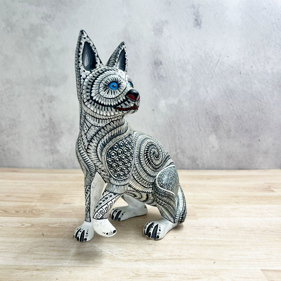 Encantador perrito alebrije sentado, está tallado y completamente pintado con intricados motivos zapotecas; es una pieza hecha a mano por artesanos de Oaxaca y es ideal para dar un toque mexicano a cualquier espacio por su estética refinada o para regalar.