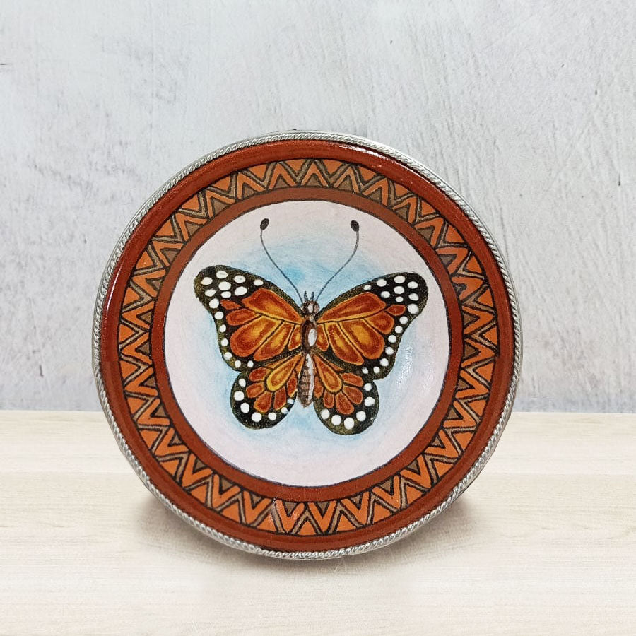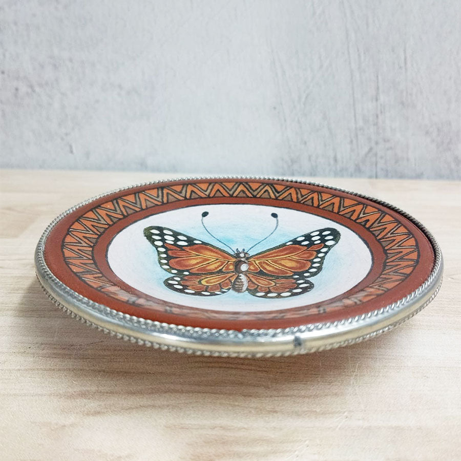 Embellece tu hogar con este platito decorado con una hermosa mariposa y agrega un toque de distinción. Está hecho en cerámica pintada a mano y aplicaciones de alpaca (aleación de metal también conocida como plata alemana) por el reconocido taller de J. Guerrero Santos.