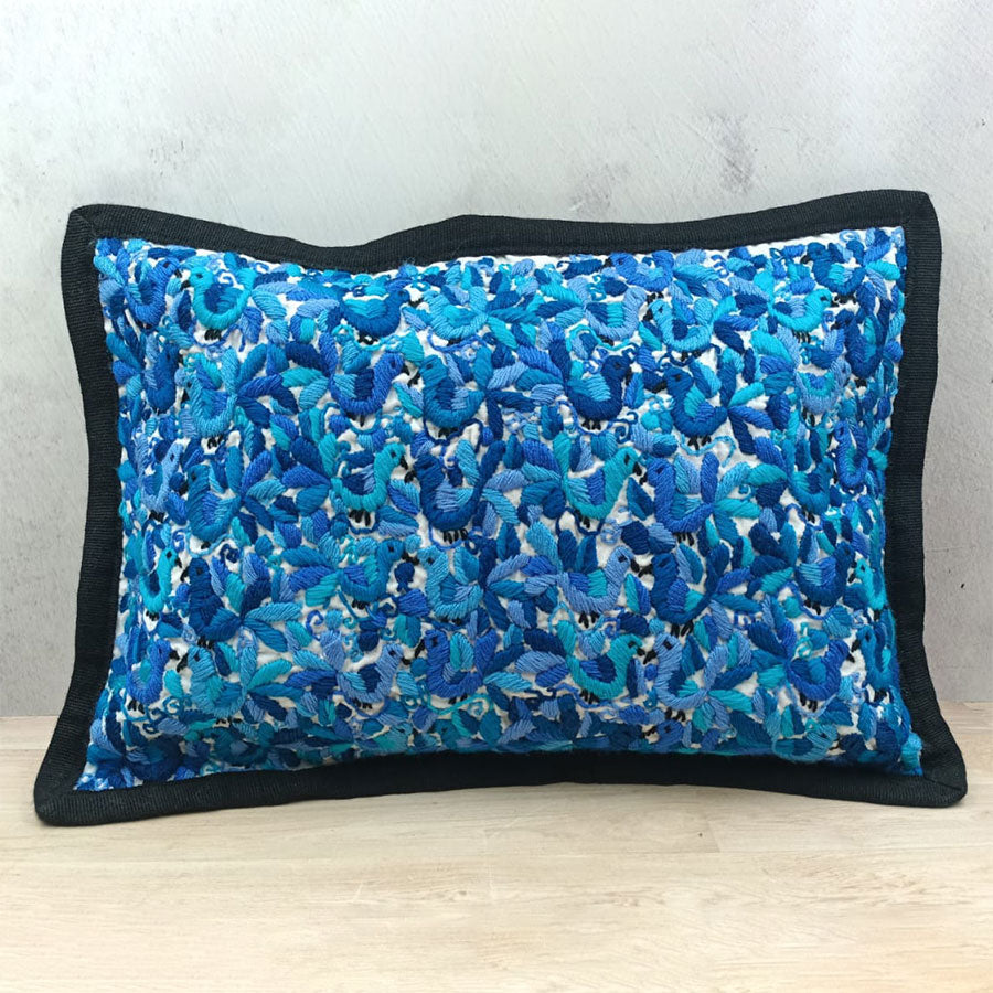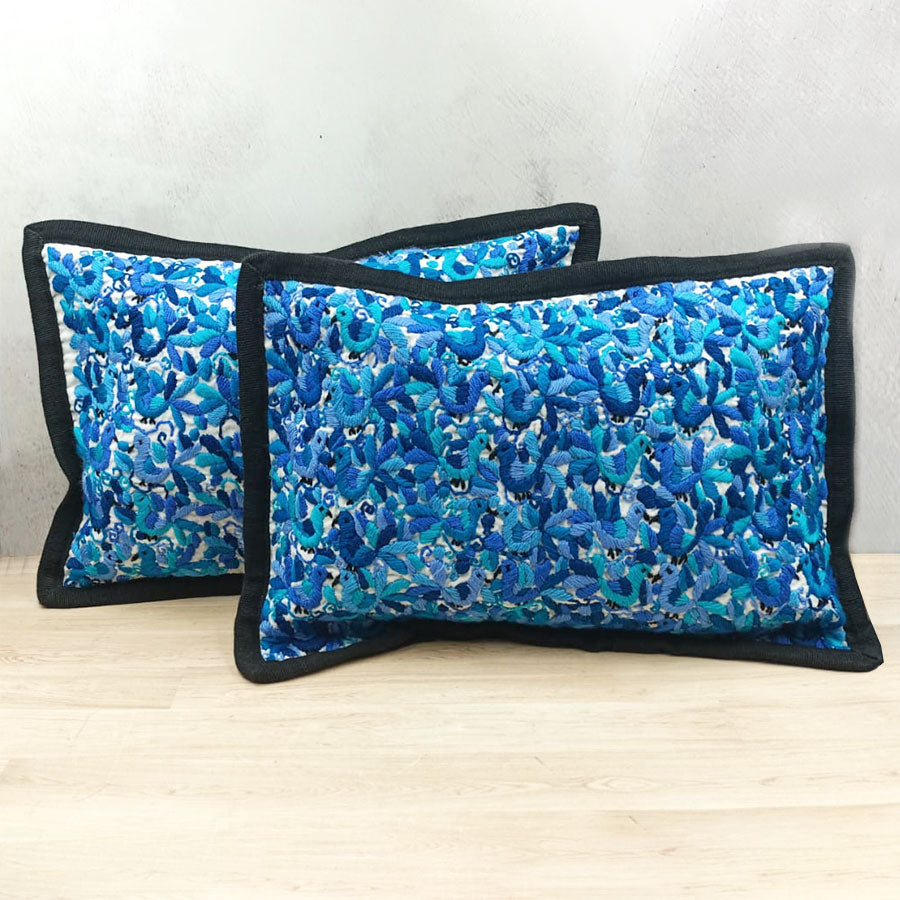 Juego de 2 fundas para cojín con motivos de aves bordadas a mano en colores azules. Ideal para decorar tu recamara o sala añadiendo una pieza única. Está hecha por artesanas de Oaxaca.