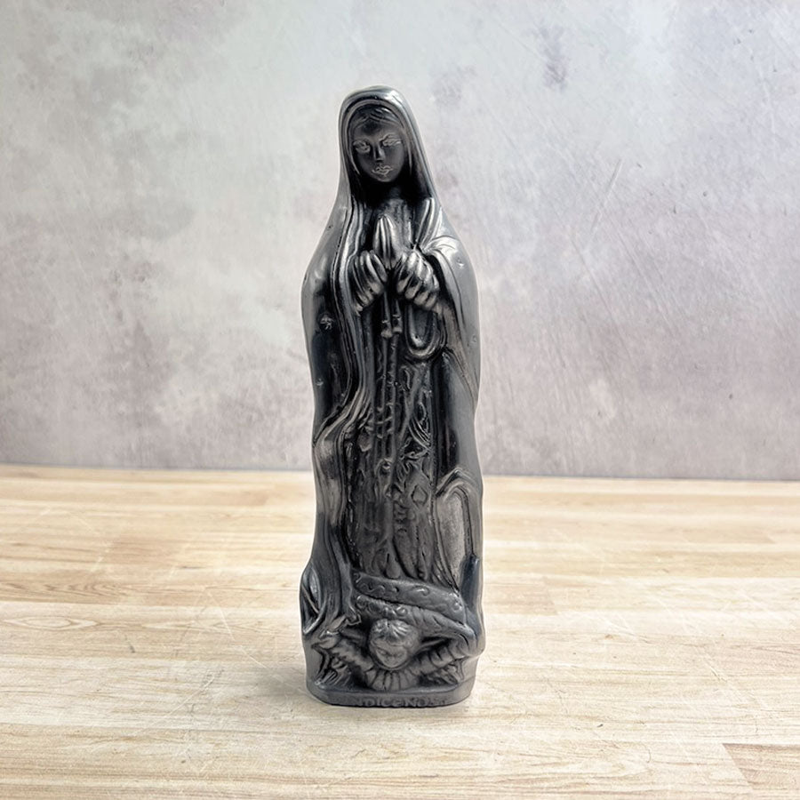 Hermosa representación de la virgen de Guadalupe hecha de barro negro por hábiles artesanos oaxaqueños. Es una pieza pulida con piedras de cuarzo o con carrizitos, y decorada con la técnica de esgrafiado, al final de este proceso se pone a cocer en un horno bajo tierra en donde al alcanzar el rojo vivo se tapa el horno para reducir el oxígeno y así obtener su característico color negro.