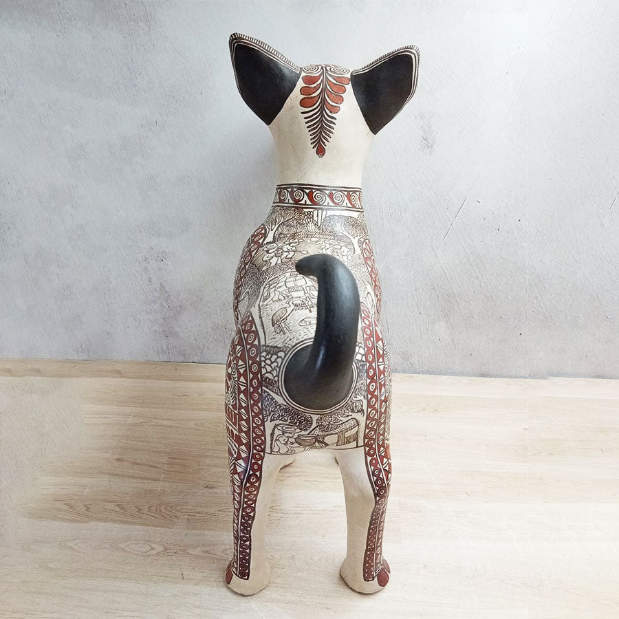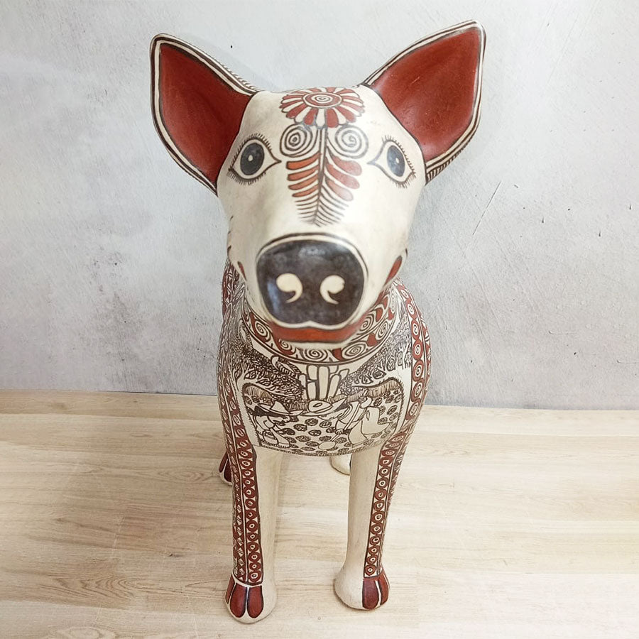 Hermosa figura que representa a un perrito xoloitzcuintle hecho de barro engobado y finamente pintado a mano con paisajes, así como flora y fauna del campo mexicano.
